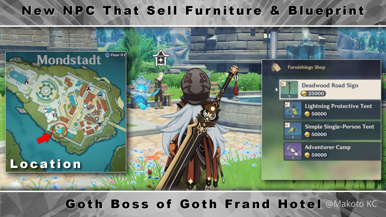 Furniture npc genshin. Theres 2 NPC who sells some furniture blueprints in Mondstadt and Liyue. 978k members in the Genshin_Impact community. 29The first furniture blueprint vendor in Genshin Impact is named Goth and he can be found near the windmills at the south end of the city of Mondstadt.